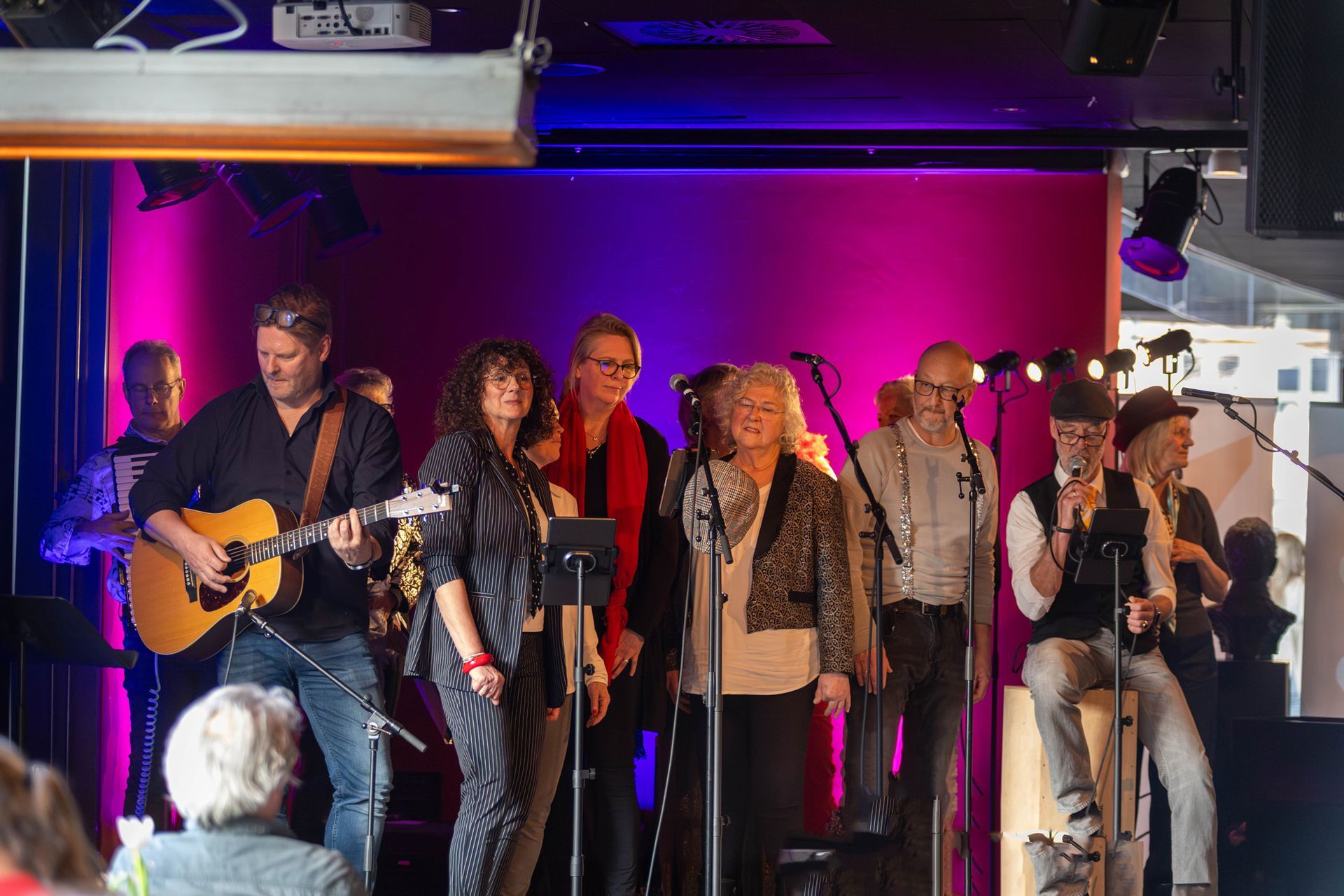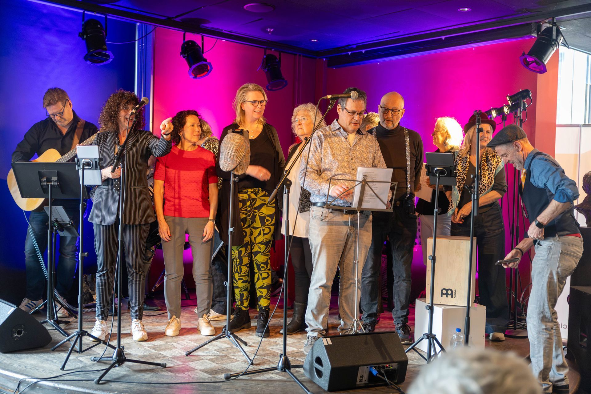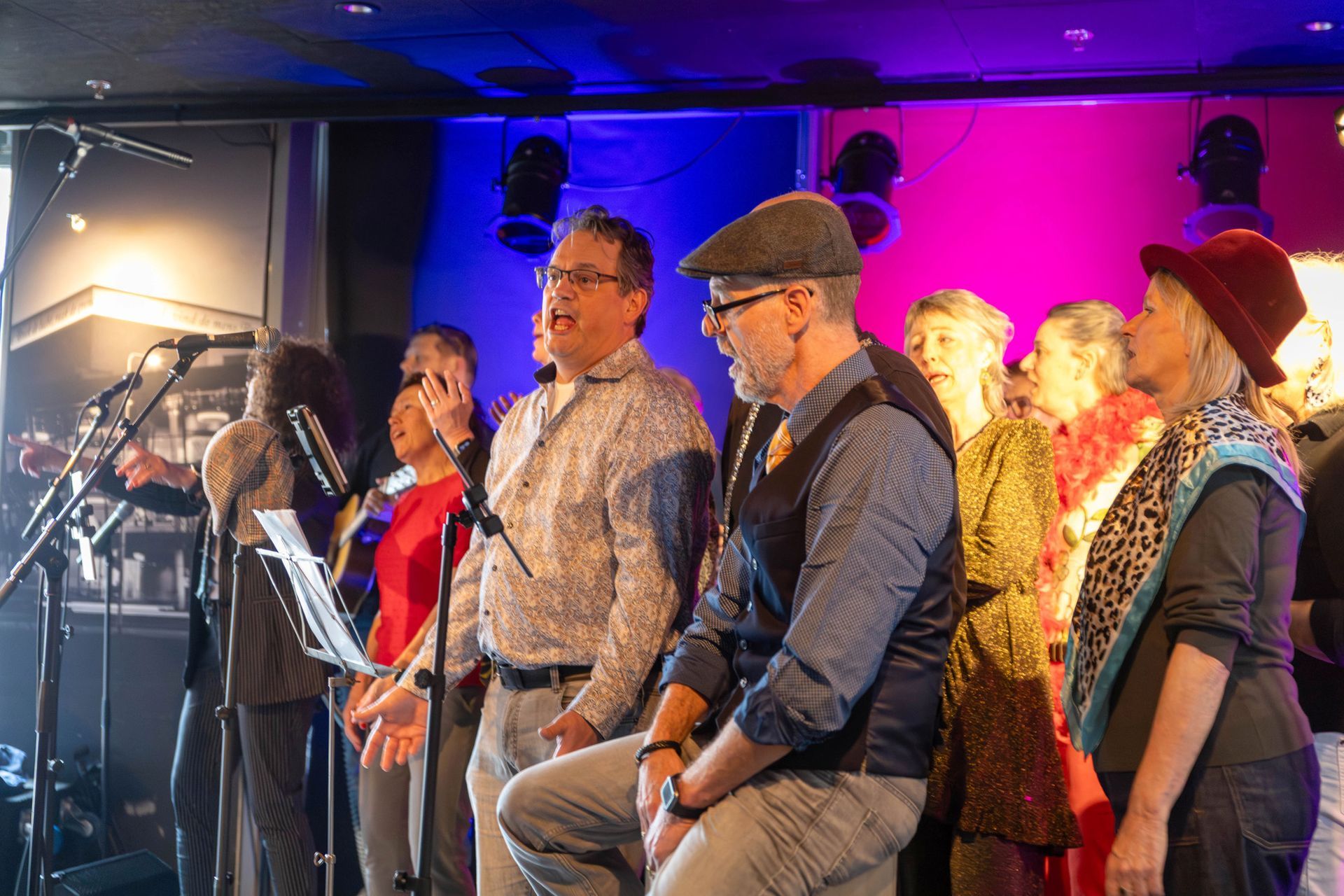Goed, wat mag je verwachten van een koor dat eenmaal per maand op donderdag een avondje repeteert? En van een koor dat smartlappen zingt? We gaan het zien. Het podium staat in ieder geval tjokvol in het theatercafé. Naast zangers zie ik een gitarist, een accordeonist en iemand op cajon.