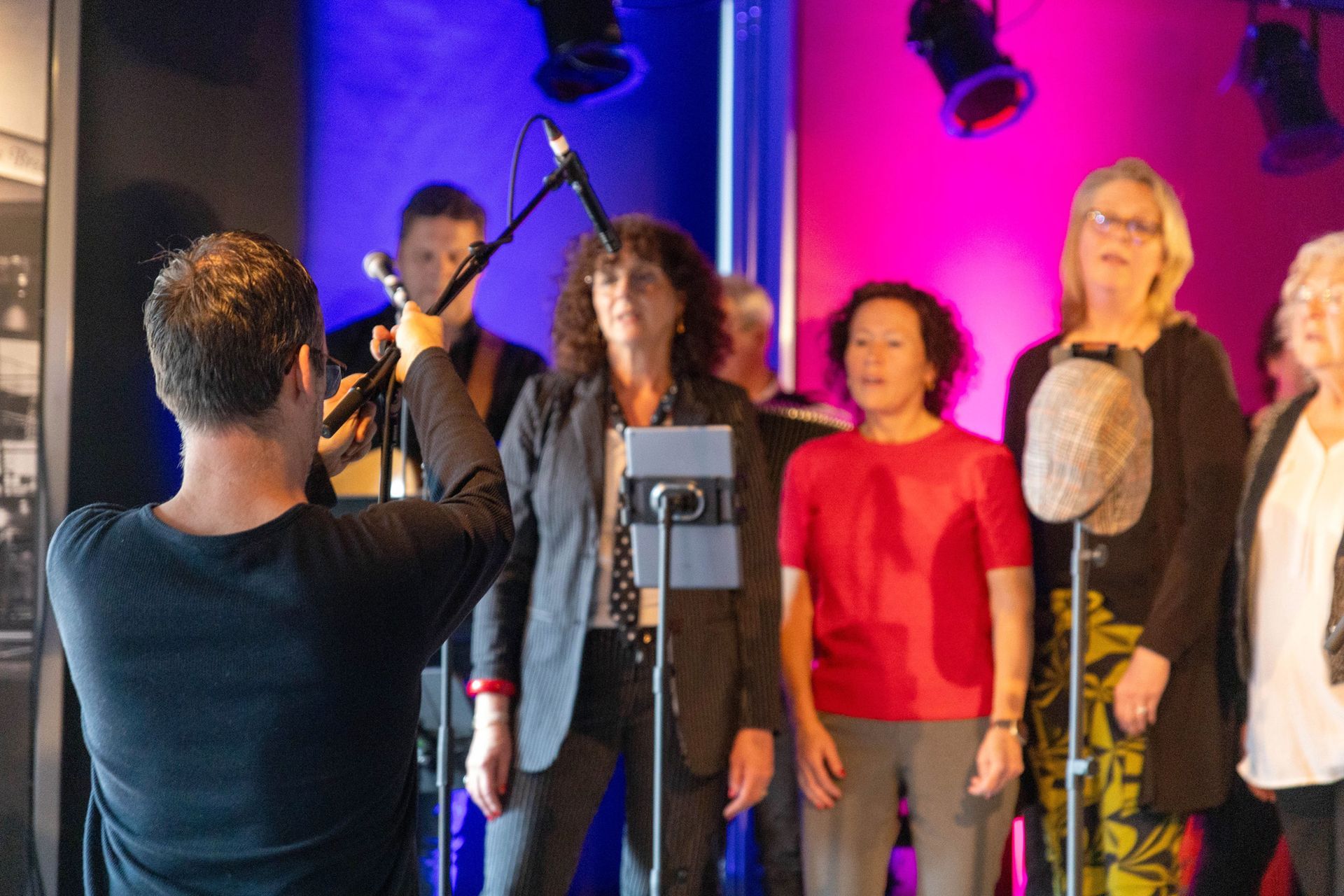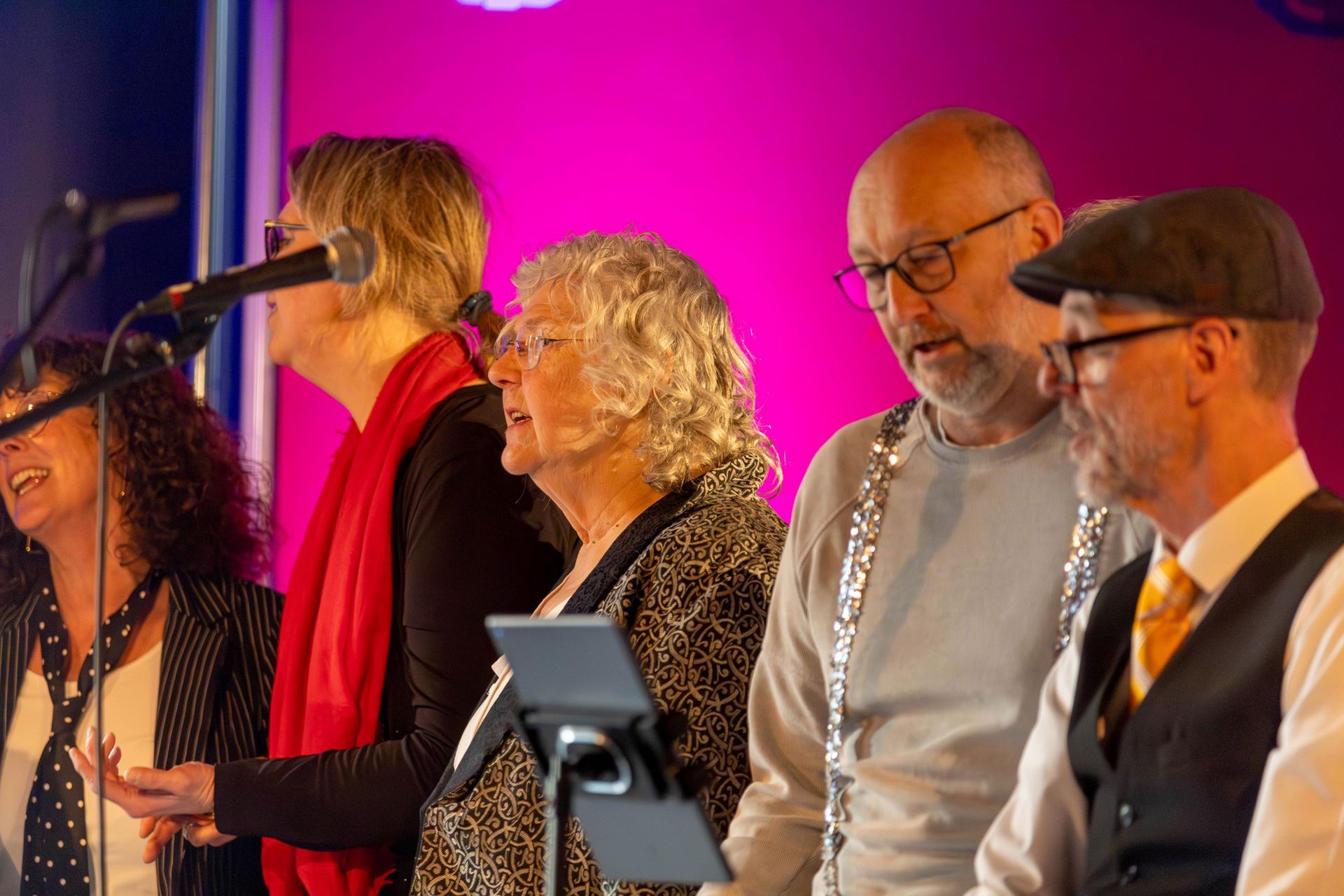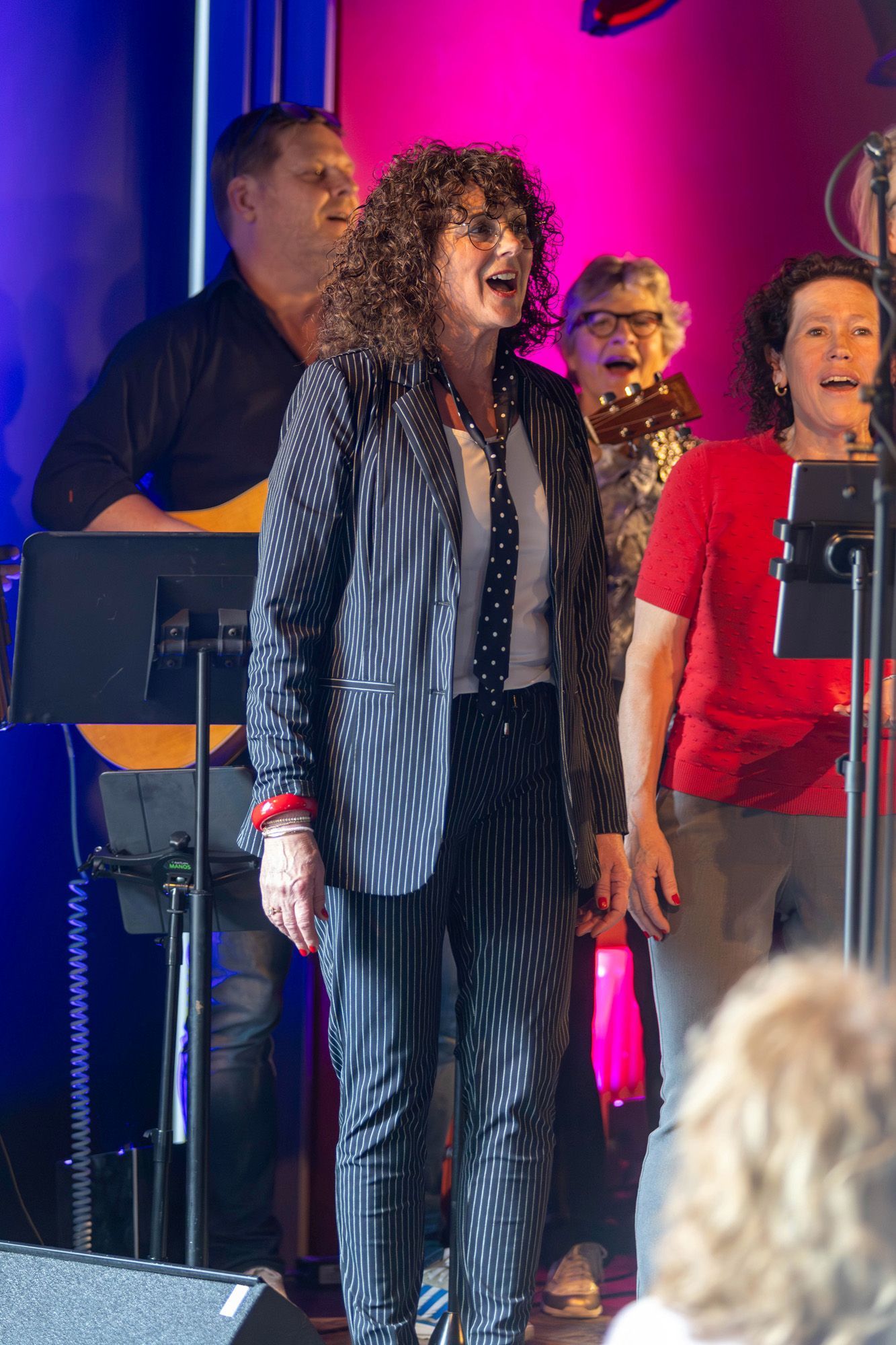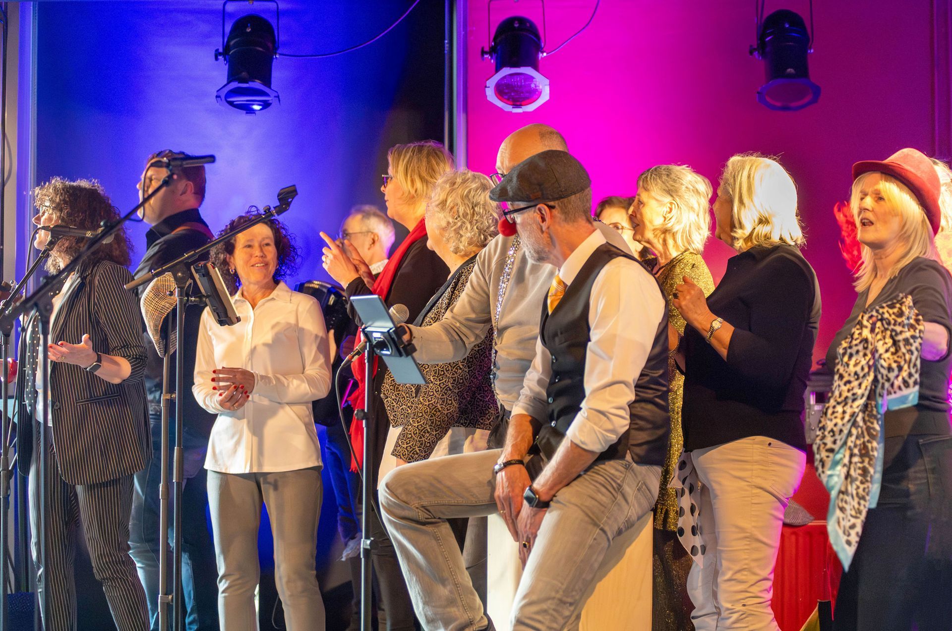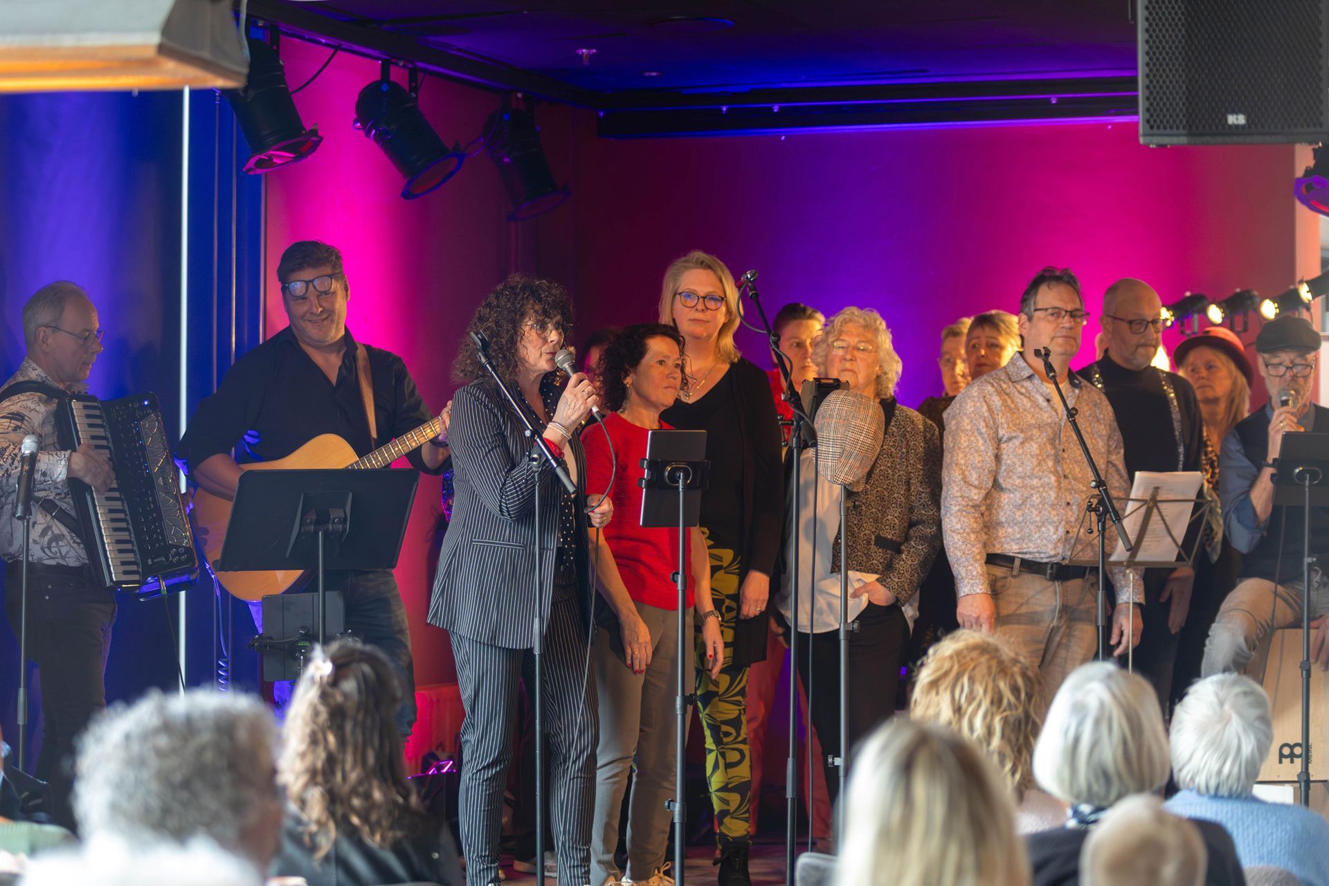 Nog een paar tips? Schuif de kleinere koorleden wat meer naar voren, zij vallen nu wat weg achter de veelal wat langere voorste mensen. En als jullie het lef hebben, en dat hebben jullie: kom waar dat van meerwaarde is eens van dat podium af en meng je met je publiek. En tot slot: in collectiviteit het publiek teasen met gebaren en beweging is zoveel krachtiger dan nu die enkeling die uit zijn bol gaat.